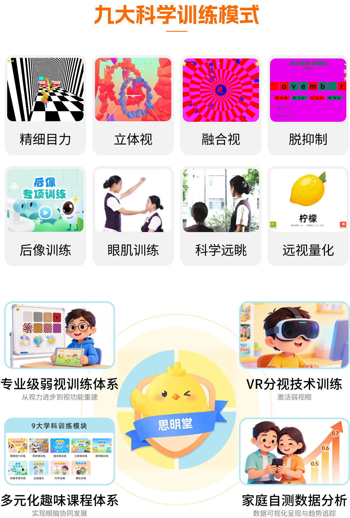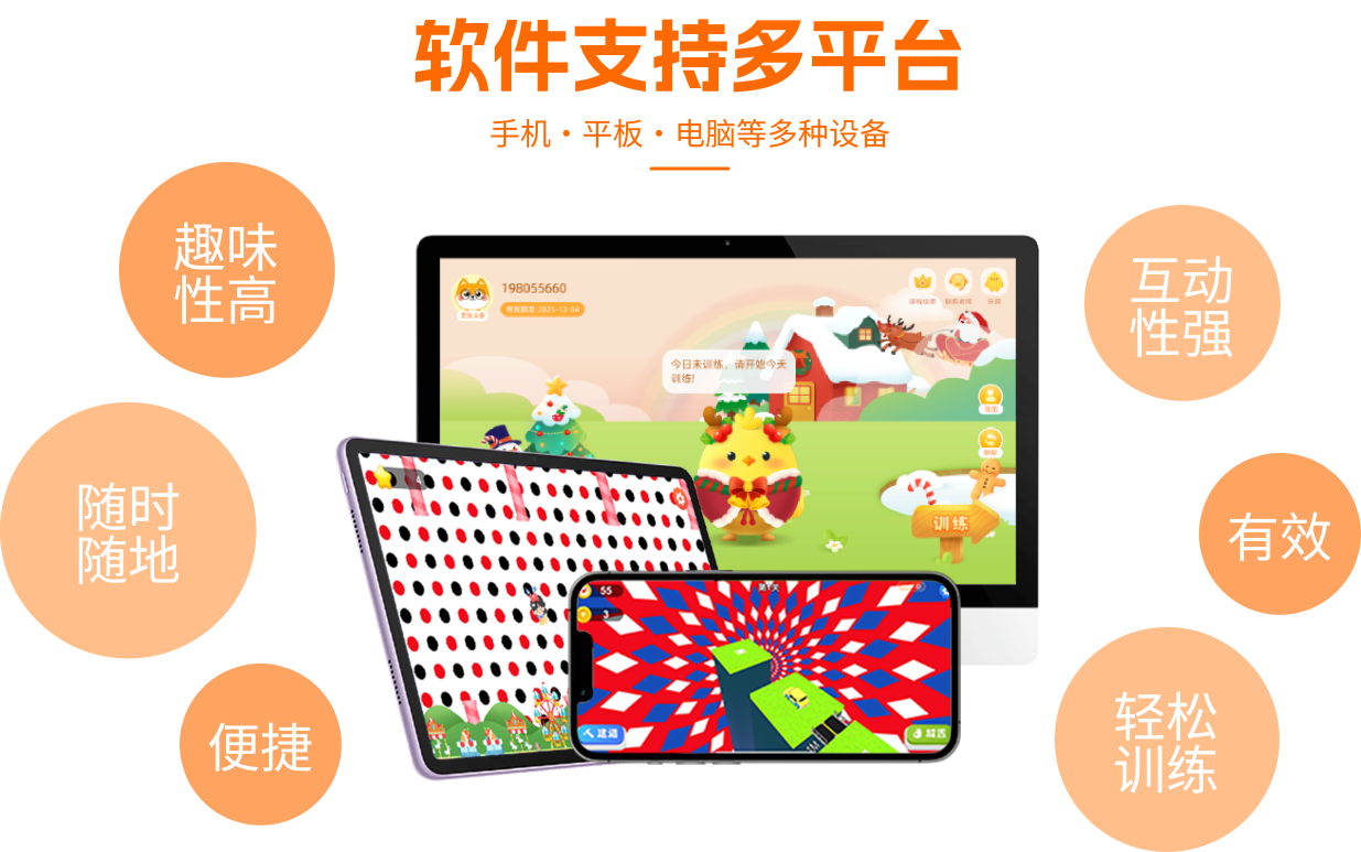 定制化训练内容 配套1对1远程服务 轻松摆脱弱视 【产品介绍】 思明堂弱视训练会员版是一款增视软件,可以为不同类型、不同年龄、不同严重程度的弱视儿童定制个性化训练方案,结合专业人工指导服务,帮助弱视儿童改善矫正视力,改善双眼三级视功能,尤其是融合视和立体视。主要针对3~12岁弱视儿童,弱视类型包括:屈光不正性弱视(远视性弱视、散光性弱视、近视性弱视)、屈光参差性弱视以及斜视性弱视。软件支持多个平台运行,用户可以通过手机、平板、学习机及电脑等设备使用。